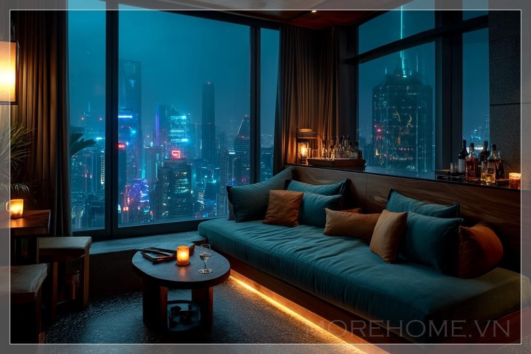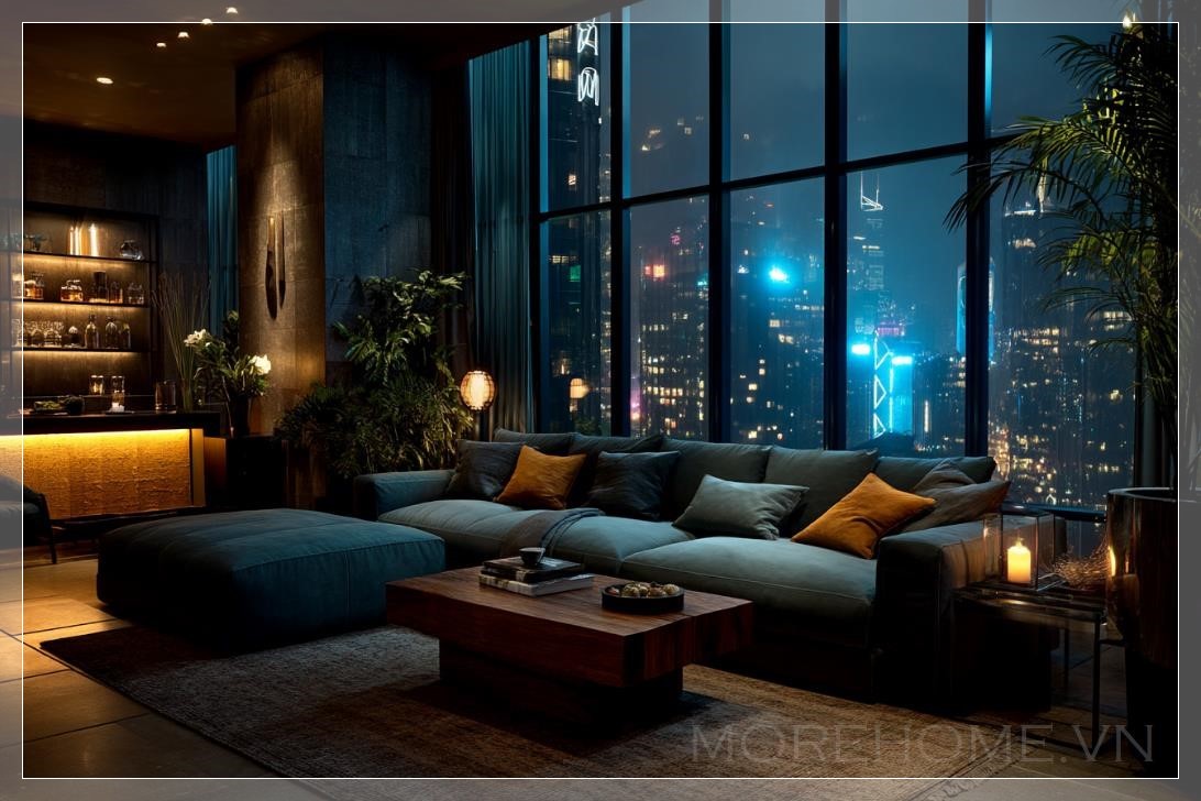 Bên cạnh đó, nội thất trong phòng khách cũng cần được chú trọng để tạo sự hài hòa. Những bộ ghế sofa với đường nét mềm mại, bàn trà tinh tế cùng với thảm trải sàn lông mịn sẽ giúp không gian trở nên ấm cúng và dễ dàng kết hợp với ánh sáng tự nhiên từ cửa sổ lớn. Đặc biệt, việc sắp xếp đồ nội thất sao cho không che khuất ánh sáng là yếu tố quan trọng trong thiết kế phòng khách cửa sổ lớn. Các yếu tố này kết hợp với nhau tạo nên một không gian sống lý tưởng, vừa hiện đại vừa gần gũi với thiên nhiên.