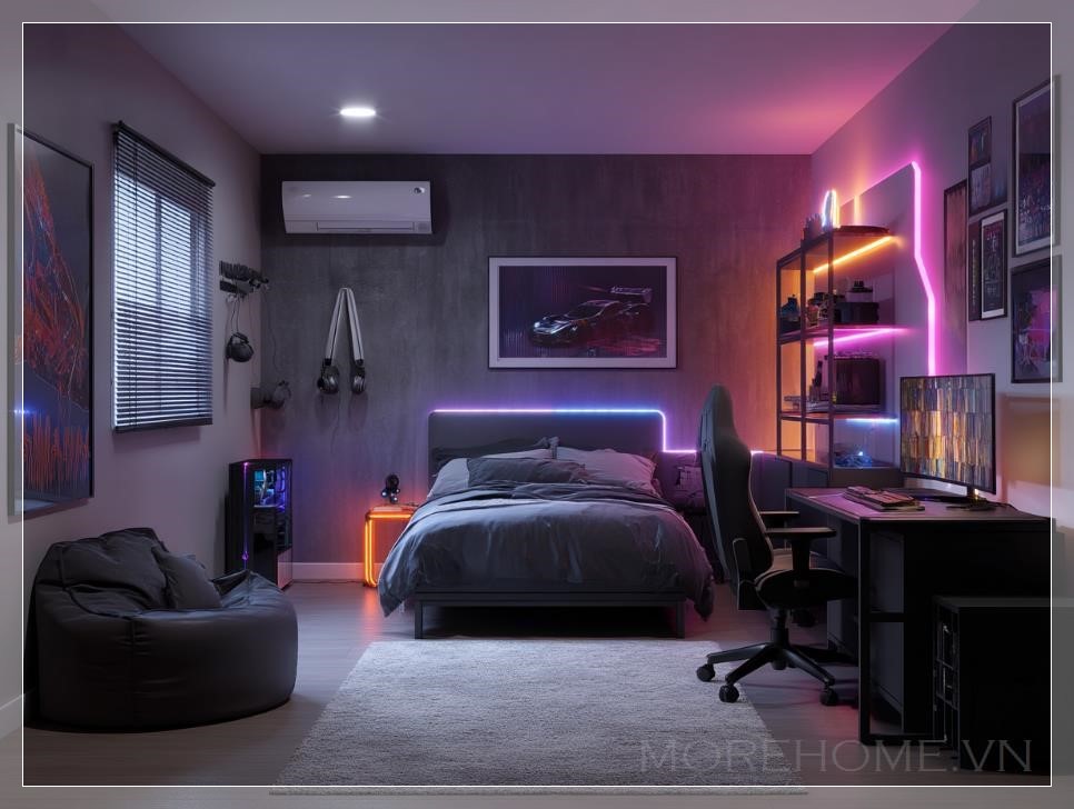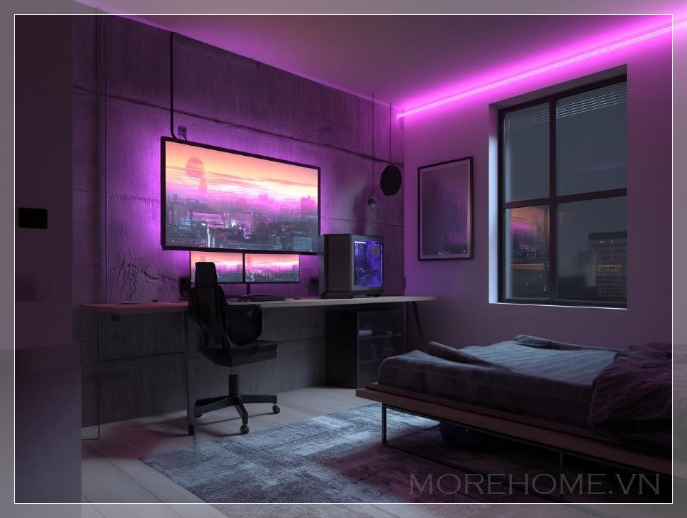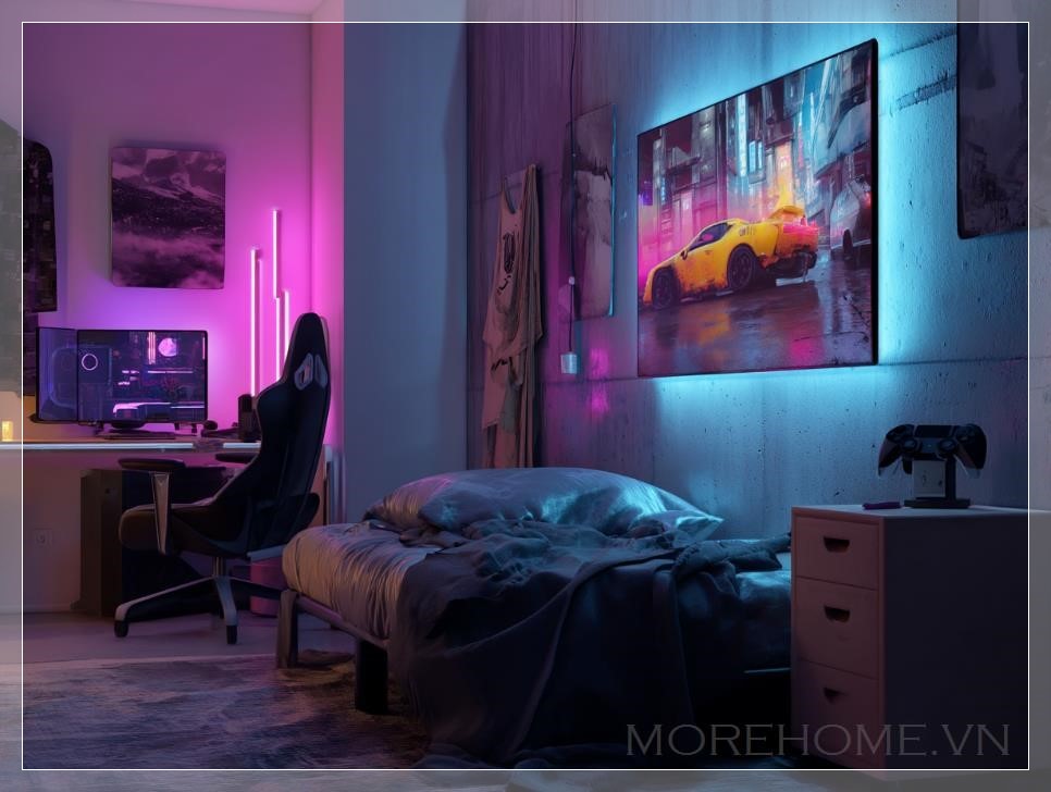 Các chi tiết trang trí trong phòng như các bức tranh game, poster các nhân vật yêu thích, hoặc đèn trang trí phát sáng theo nhạc, tất cả đều góp phần tạo ra một không gian đầy năng lượng. Mỗi ánh đèn LED có thể thay đổi màu sắc và độ sáng, giúp chủ nhân dễ dàng điều chỉnh theo tâm trạng hoặc mục đích sử dụng, từ việc tập trung chơi game đến thư giãn hay làm việc.